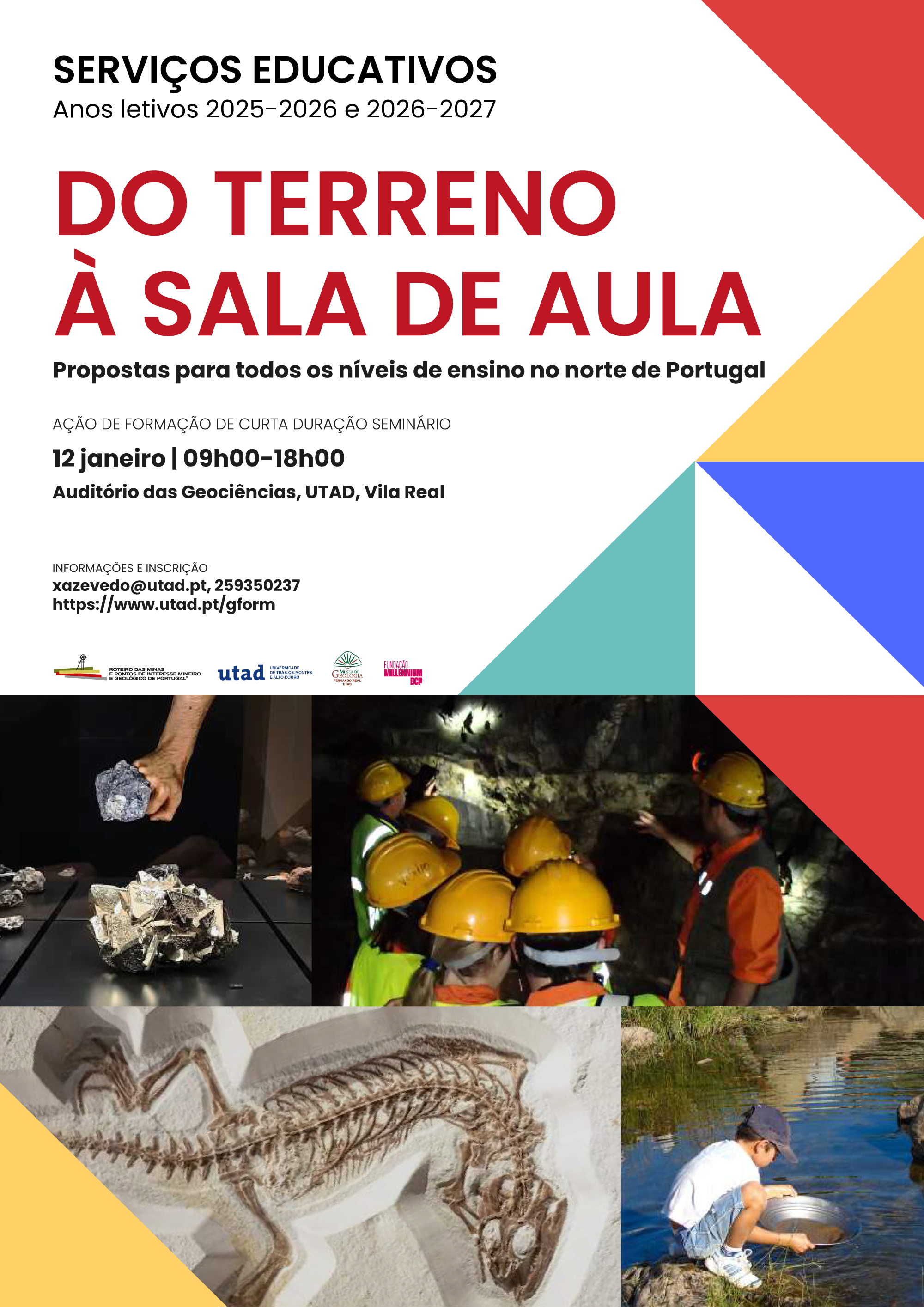 Ação de formação em Serviços Educativos: ""Do Terreno à Sala de Aula em Pontos de Interesse Mineiro e Geológico da Região Norte"" Visitas de Estudo, Atividades 2025-2026 e 2026-2027. AFCD - Ação de Formação de Curta Duração para estudantes do ensino Superior, agentes de turismo e professores de todos os níveis de ensino. DIa 12 de janeiro de 2026 na Universidade de Trás-os-Montes e Alto Douro - UTAD, em Vila Real